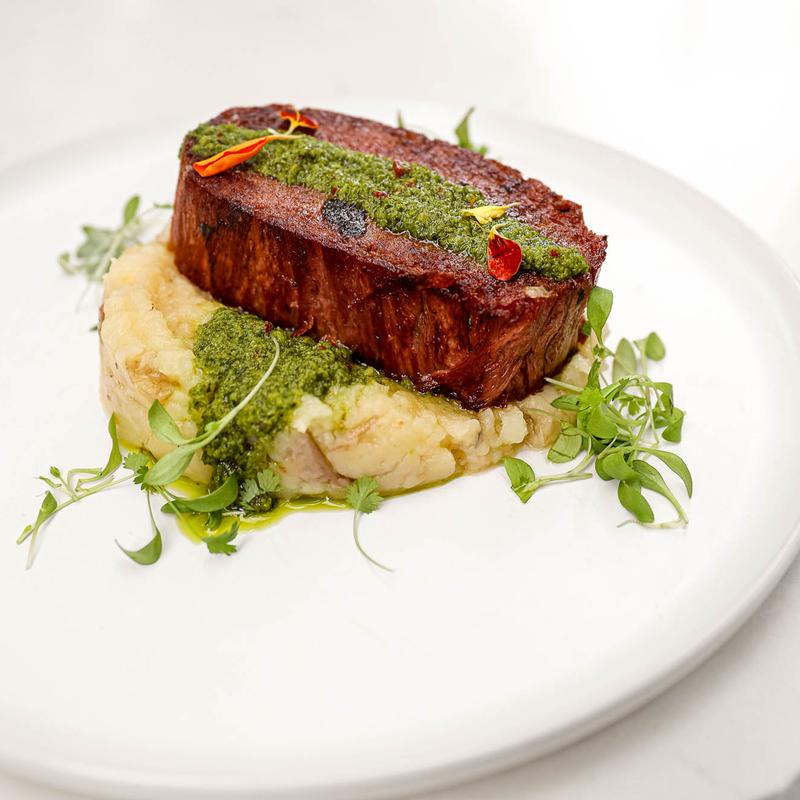 Plant based fillet mignon, oven roasted mashed potatoes and chimichuri
