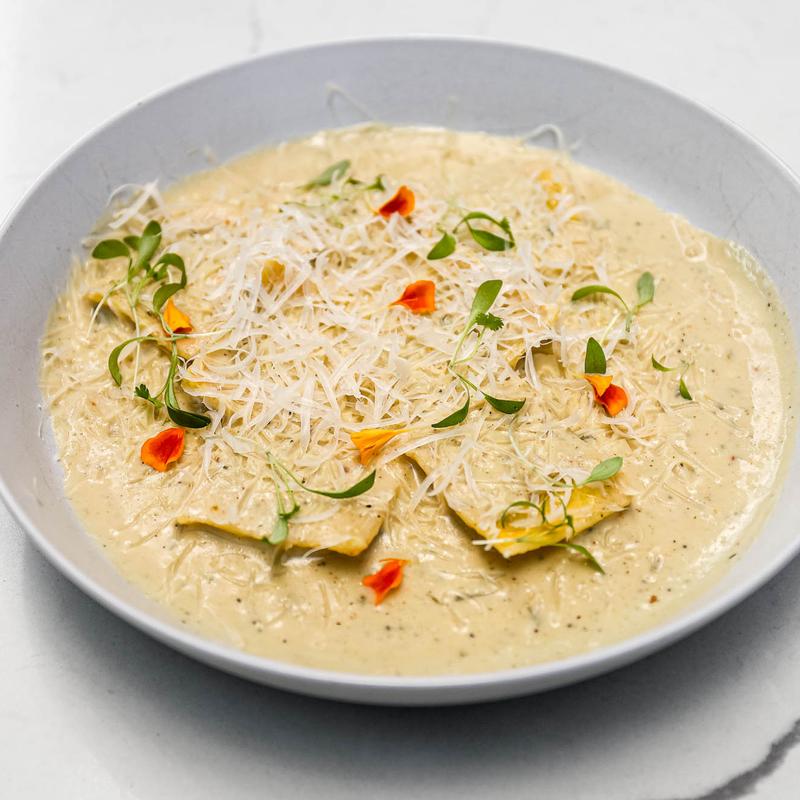 Local ravioli on a truffle alfredo sauce, topped with parm crumble and local flowers